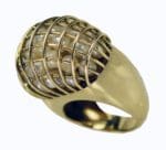 Marc Koven – who as a painter specializing in nudes and notably was the object of a 1957 one‐man show at the Lynn Kottler Gallery, later also turned to expressionistic sculpture in bronze. He originally came to New York City from Paris in 1940, where he established his jewellery studio on East 48th Street.  One year later, his creations were being sold at Bergdorf Goodman who used his jewellery in their New York Times advertisements.  Throughout the 1940s and 50s, Koven’s creations were featured in Harper’s Bazaar, Vogue and Town and Country. He was regarded as an innovator in jewelry design and was the inventor of caged jewels— stones placed unset inside small gold cages (see historical image in the photos). Formal validation crowned Marc Koven’s work, and he was six times a winner of the coveted Diamonds International Jewellery Design Award. He also had a fashionable Paris jewellery shop on Avenue Victor Hugo.