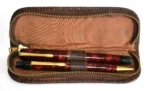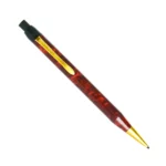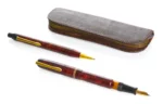 This is a perfectly kept 1950s Soennecken piston filler fountain pen, crafted in exquisite Ruby Web Striped celluloid, with 14K solid gold nib, plus golden pocket clip and trim… Complete with identically matching Soennecken 125 Mechanical-pencil.