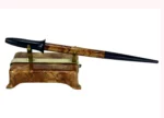 Additionally, this Waterman SkyWriter desk set holds an honored place in fountain pen history. There were three generations of Waterman SkyWriter fountain pens, each produced in a different era, and all very different pens from one and another. The first generation – of which this desk set is a “cherry example” – consisted of flagship-model celluloid pens. They were crafted for Waterman by the renowned Aikin-Lambert Pen Company soon after Waterman had acquired ownership of this Firm… but before Aikin-Lambert had been fully absorbed into the Waterman parent-company. For information, the SkyWriter pens first appeared in a 1937 Waterman brochure. They were offered in luxury pyralin-celluloid colors of which the most sought after today are the striped examples, respectively named Brown Pearl (like the present desk set), Green Pearl and Gray Pearl.